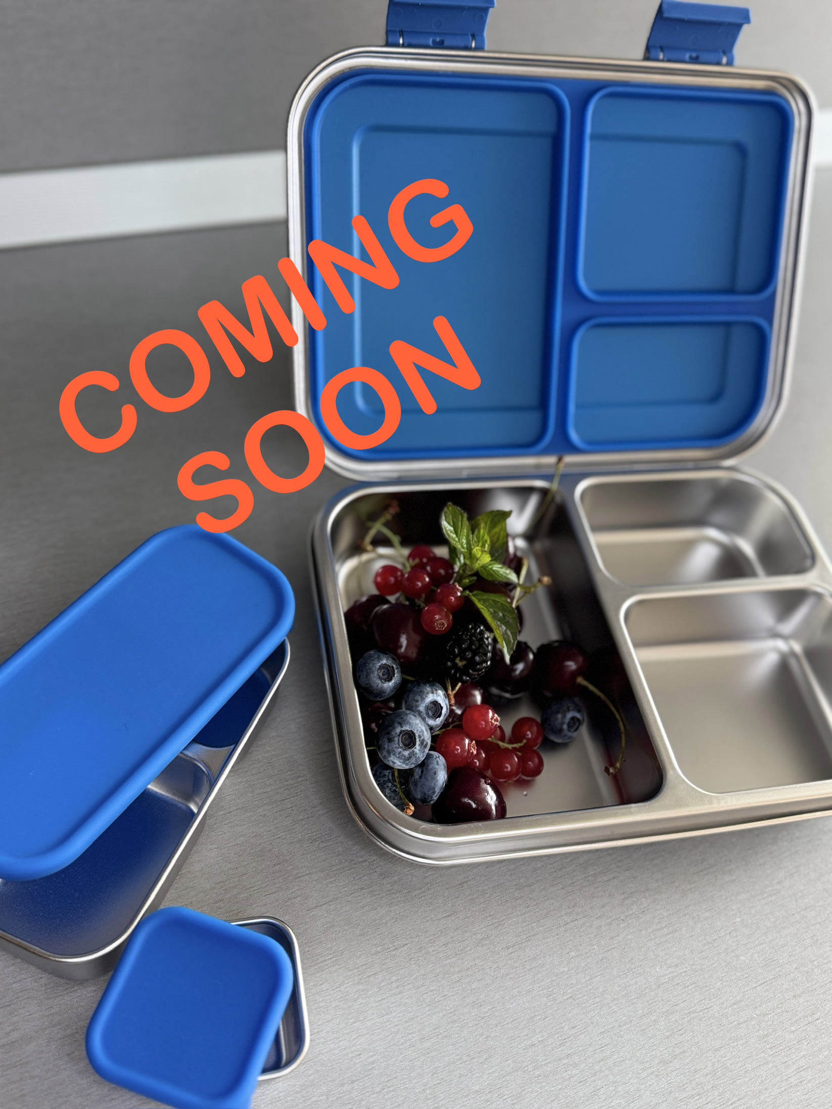 The lunch box includes three separate compartments: one larger section, ideal for sandwiches, wraps, or salads, and two smaller ones for sides like nuts, berries, or snacks. Additional small sealed containers are perfect for storing sauces or sweets separately to prevent mixing with other food.